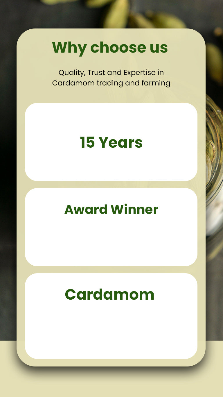 the recipient of numerous Export awards, with its corporate headquarters & processing facilities located in Panickankudy, Idukki district, INDIA, has supplied Plantation Fresh Cardamom to satisfied customers globally for over 40 years
